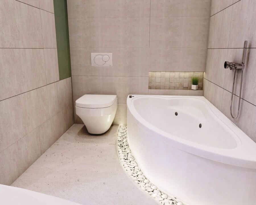- Есть прекрасный вариант для квадратных помещений – угловая ванна. Она сохранит необходимое пространство, и не будет смотреться массивно.