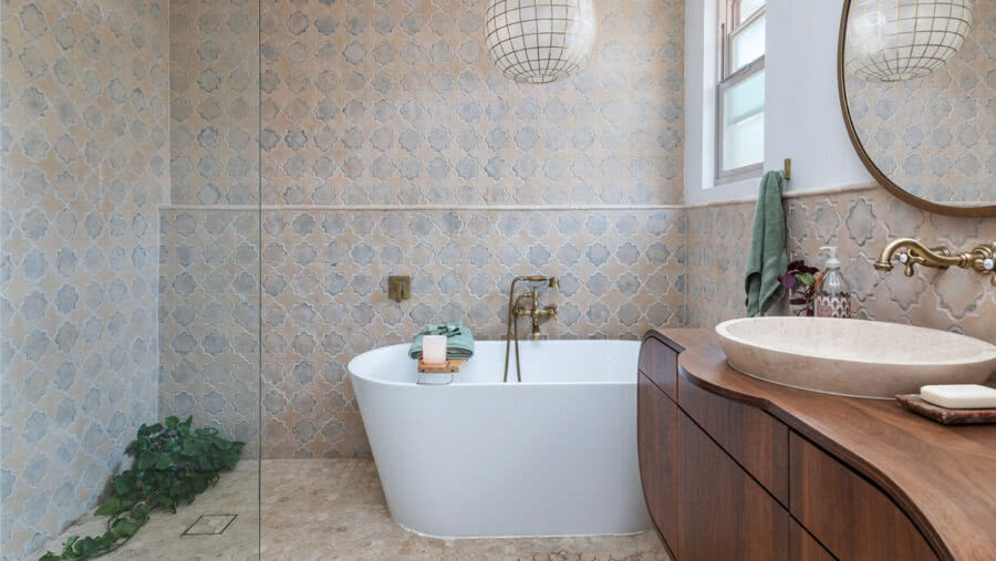 - Ванна, отделанная плиткой, подходит средиземноморскому стилю и свидетельствует о хорошем вкусе.