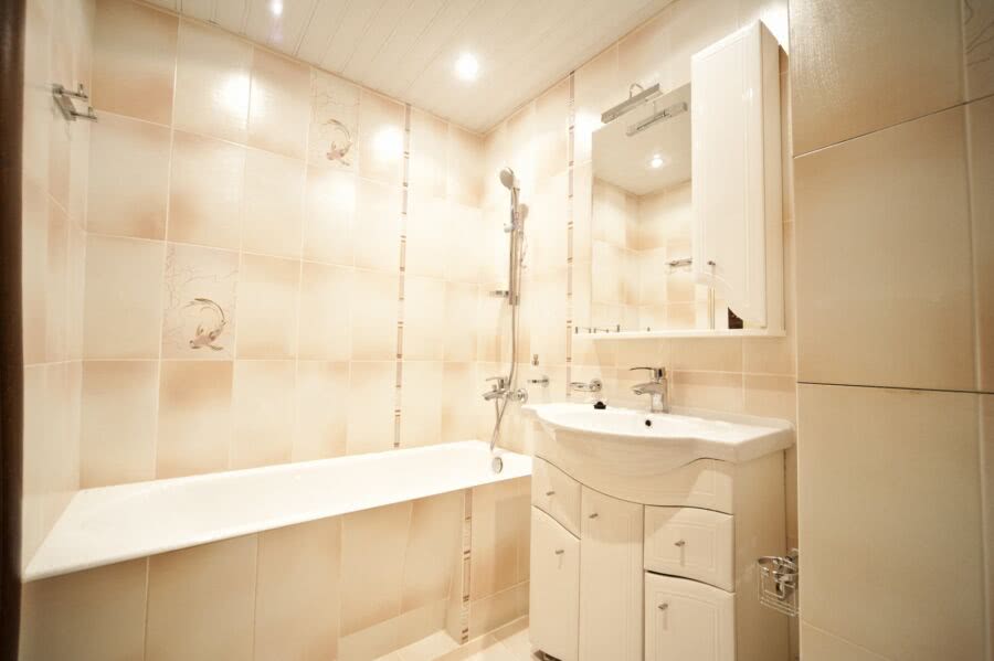 Наиболее спорной задачей при отделке ванной является выбор потолка. Здесь стоит присмотреться к натяжному потолку или проверенному гипсокартонному. Оба варианта не скапливают влагу и доступны для встраивания светильников.