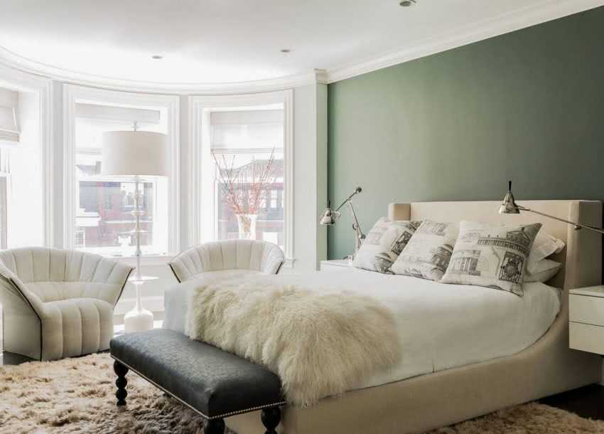 Создайте в своей спальне контрастные стены! Такой прием смотрится стильно и помогает визуально изменить пространство. Например, отличным решением для вытянутых комнат станет покраска дальней стены в темный цвет. Благодаря этому она, на общем нейтральном фоне, будет казаться ближе.