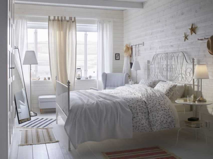 Легкость в обстановке. Изначально стараемся уйти от тяжелых и громоздких вещей. К примеру, если в обычной спальне традиционно ставятся вальяжные прикроватные тумбочки, то интерьер спальни 9 кв м нужно делать облегченным, вместо этих тумбочек ставим фигурные табуреты, а лучше изящные полочки по обе стороны кровати или над изголовьем кровати;