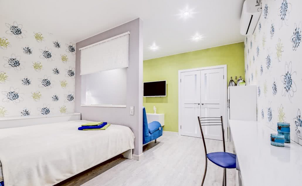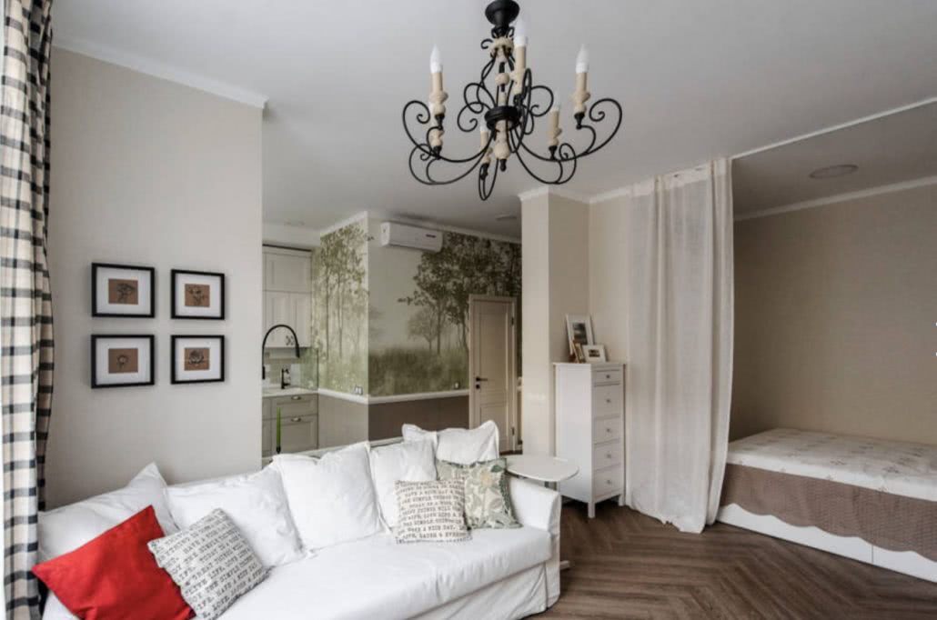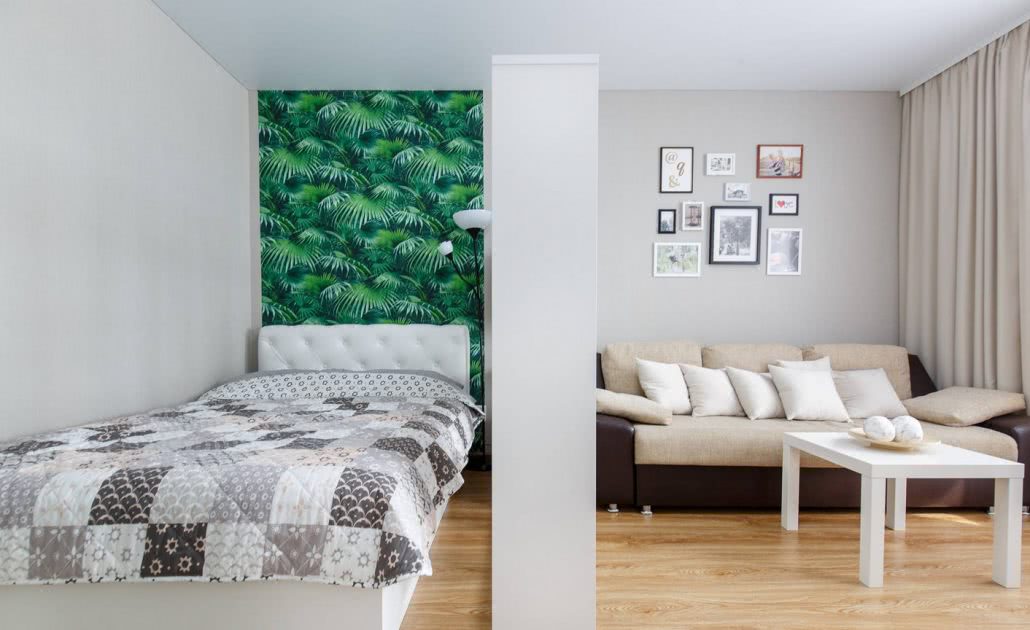 Кроме физического разделения, зонирование гостиной-спальни в одной комнате можно проводить при помощи: