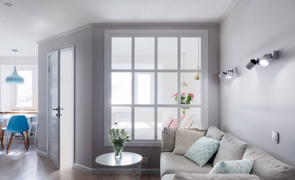 Чтобы не затенять комнату, особенно если окна выходят на северную сторону, помещение делят с помощью комбинированных моделей.
