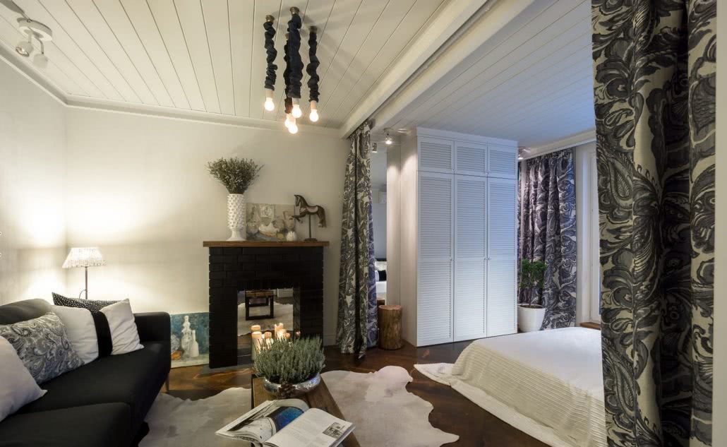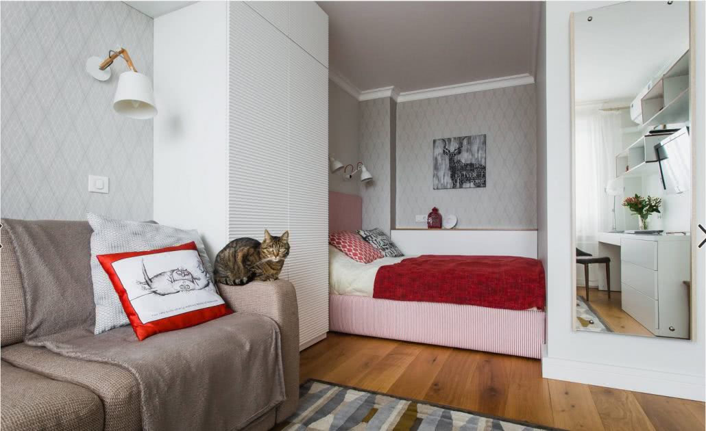 Самым ценным в комнате окажется кровать, так как она должна быть спрятана от посторонних глаз. Удачным выбором отгородить спальню от зоны отдыха, при этом не забрав пространство.