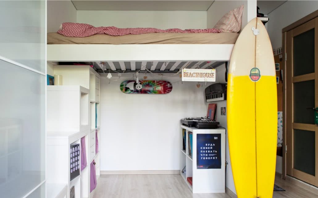 Если в квартире высокие стены, этим нужно воспользоваться и поделить пространство на два уровня. Более эффектно выглядят этажи, нависающие над гостиной, к которым ведет компактная лестница. Плюс спальни на втором ярусе в том, что низкие потолки никак не помешают крепкому сну.