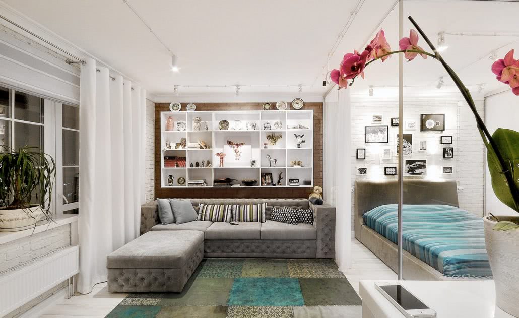 На более просторных территориях можно расположить большую двухместную кровать, а также кожаный диван с кофейным столиком и телевизором напротив. Зону гостиной и спальни в подобных условиях можно разграничить с помощью гипсокартонной конструкции, представляющей собой небольшие квадратные полочки.