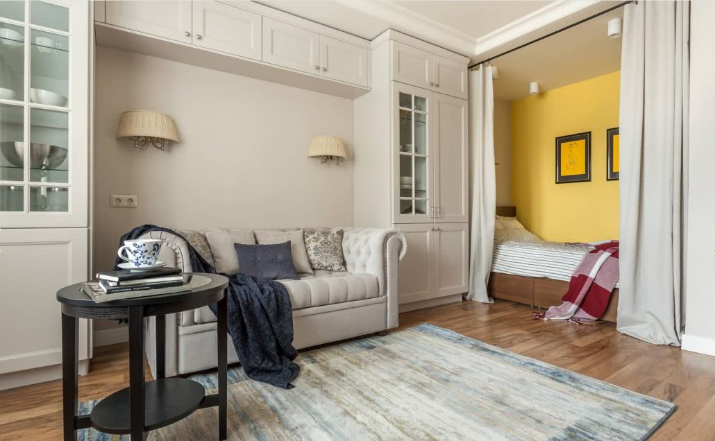 Такой вариант оформления спальни с гостиной больше подойдет молодым людям, ведь не каждый пожилой человек сможет ежедневно раскладывать и складывать кровать.