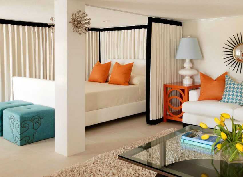 Проще всего разделить помещение на зоны – это использовать шторы. Очертив кровать с нескольких сторон текстилем, можно надежно спрятать ее от посторонних глаз. Основное преимущество такого метода – мобильность. Текстильную перегородку можно легко собрать или наоборот опустить при необходимости.