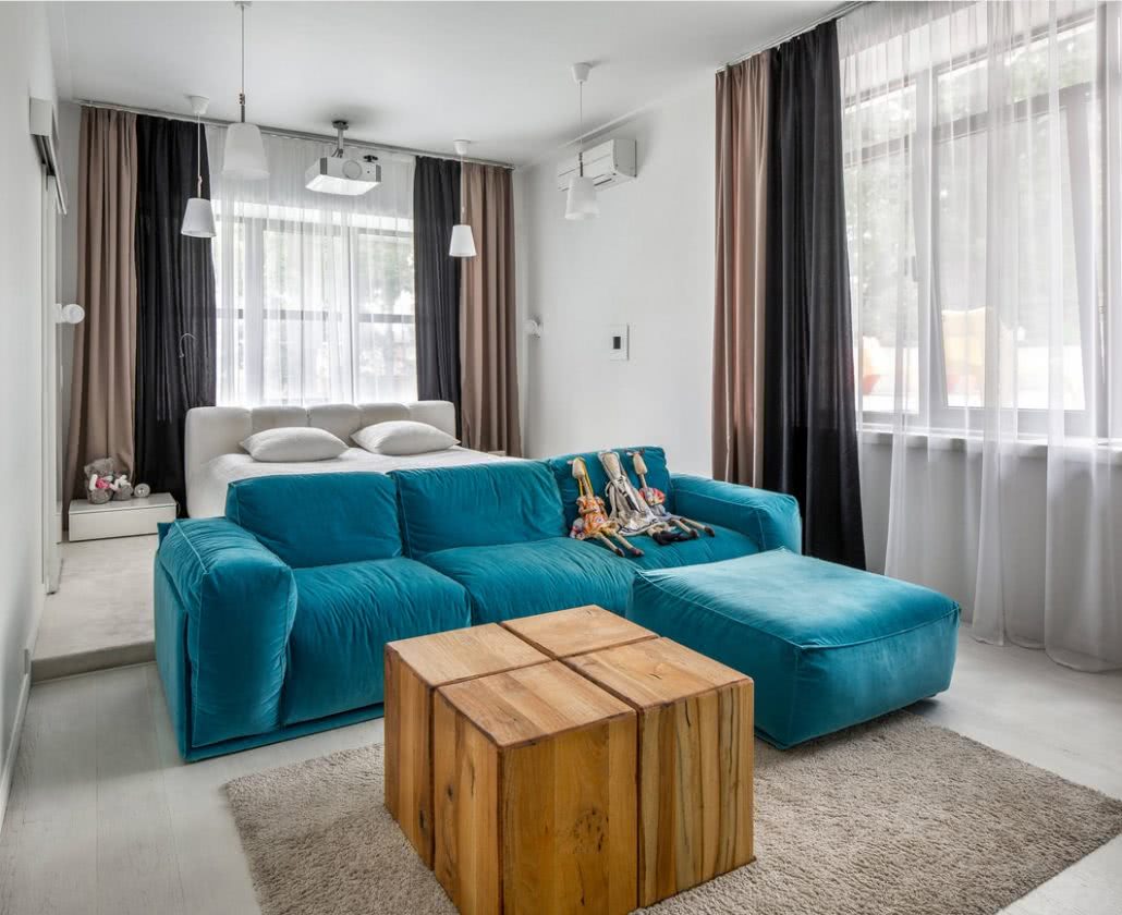 В комнате площадью 20 кв. м можно уместить двуспальную кровать и отделить ее от гостиной зоны с помощью красивых штор. Гостиную территорию можно визуально разделить на две половины: возле одной из стен поставить угловой Г-образный диван с кофейным столиком, а напротив другой – тумбу с телевизором.
