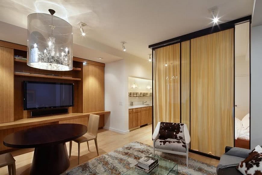 Те, кто к вопросу зонирования подходит основательно, часто выбирают для разделения пространства раздвижные конструкции. С их помощью можно надежно защитить интимную часть комнаты. Материал такой конструкции может быть разным. Сегодня чаще всего используют стеклянные двери в сочетании со шторами.