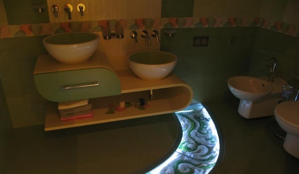 Также могут применяться светодиодные ленты на мебельных фасадах, точечные лампы, встроенные в напольное покрытие.