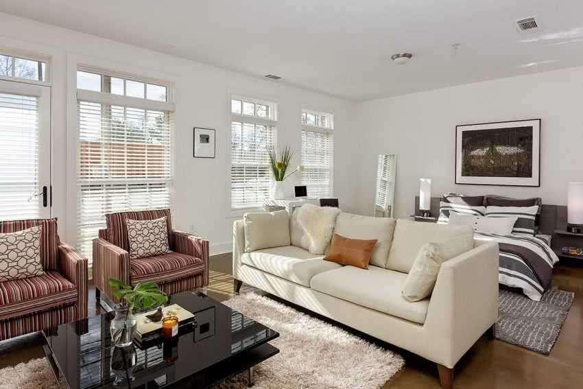 В гостиной, совмещенной со спальней, стиль лофт будет также уместен, как и минимализм. Оба эти стиля пропагандируют максимум естественного света, который позволяет даже самое маленькое помещение сделать просторным.