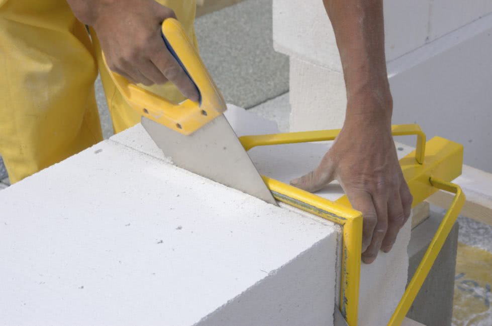 Чтобы выполнить кладку стен, используют раствор или специальный клей, который наносят специальным инструментом или гребенчатой лопаткой