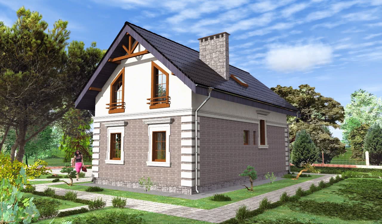 Вариант с мансардой. Интересное решение – окна в крыше, которые обеспечивают доступ солнечных лучей и делают помещения более светлыми. У этого коттеджа есть небольшой балкон и гараж.