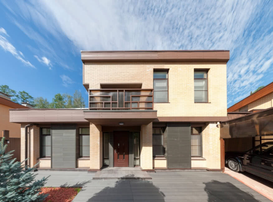 Коричневый цвет – один из самых популярных решений для крыши. Именно поэтому самый распространённый вопрос – это «какой цвет фасада подойдет к коричневой крыше?». Ответ здесь довольно прост: любые светлые тона, гармонирующие с коричневым, например, бежевый.