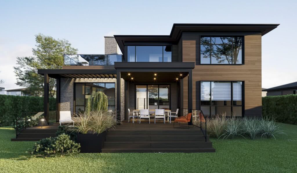 Кровля часто выпускается в таком оттенке. Элементы обустройства создаются в более темных или аналогичных оттенках. Со стенами сложнее – они оттягивают на себя больше внимания. Их в проекте стоит прорабатывать особенно серьезно и просить дизайнера довести расцветку до уровня, полностью приближенного к реальности с учетом освещения.
