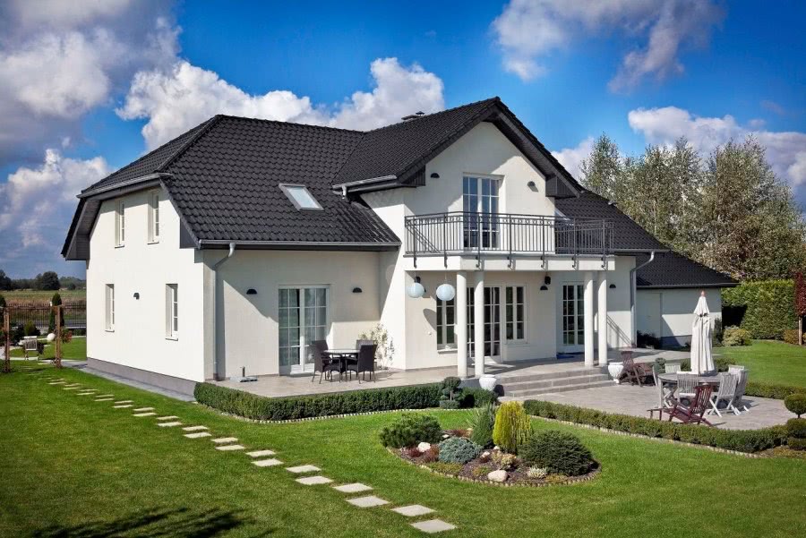 - современно смотрятся белые стены у дома с красной крышей или оранжевой.