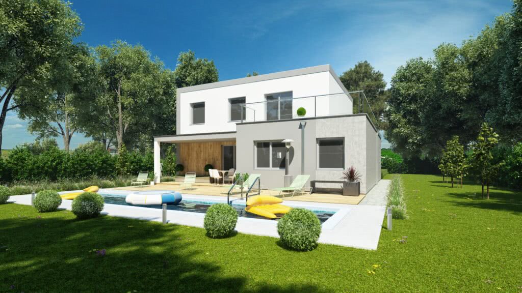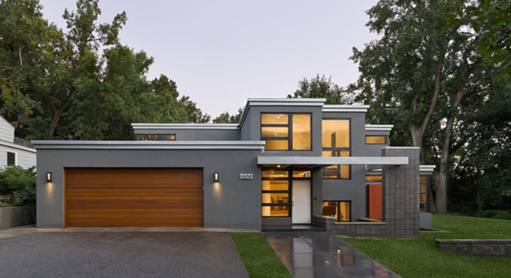 Серые стены встречаются реже. Хотя в современную архитектуру модные серые поверхности вписываются гармонично. Темно-серая штукатурка даже у здания с наклонной кровлей выглядит современно. Современный стиль подчеркнет серая металлическая кровля.
