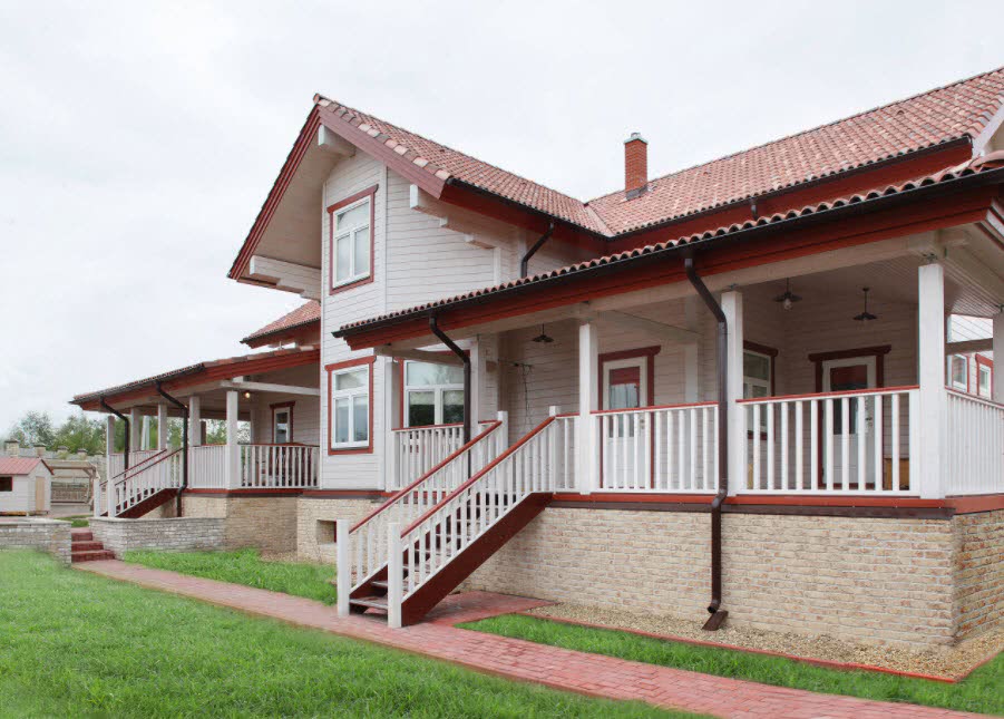 Очень популярны в отделке стен дома белые и серые цвета. Первые относятся к категории нейтральных и готовы сочетаться с любыми оттенками, вторые – скорее служит фоном, подчеркивающим яркость и красочность остальных конструкционных элементов фасада. Дополнив любой из этих вариантов отделки стен красной крышей, вы получите вечно модную классику.