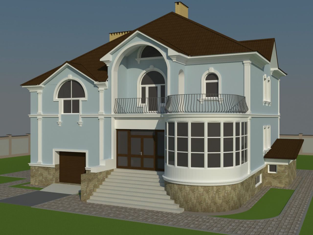 В сине-голубой гамме можно оформить и солидный частный дом, особенно если подобрать интересные, сложные оттенки, разбавленные серым и как-бы слегка припыленные. Сейчас можно приобрести темно-синюю мягкую черепицу с неравномерным окрашиванием, которая добавит композиции благородства.