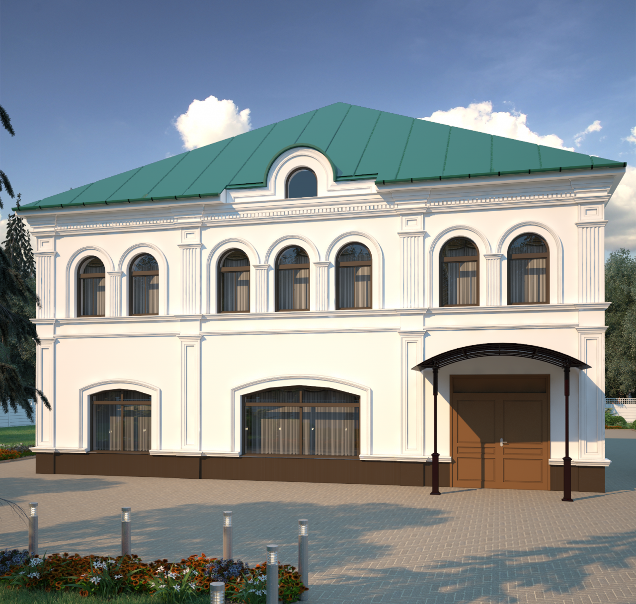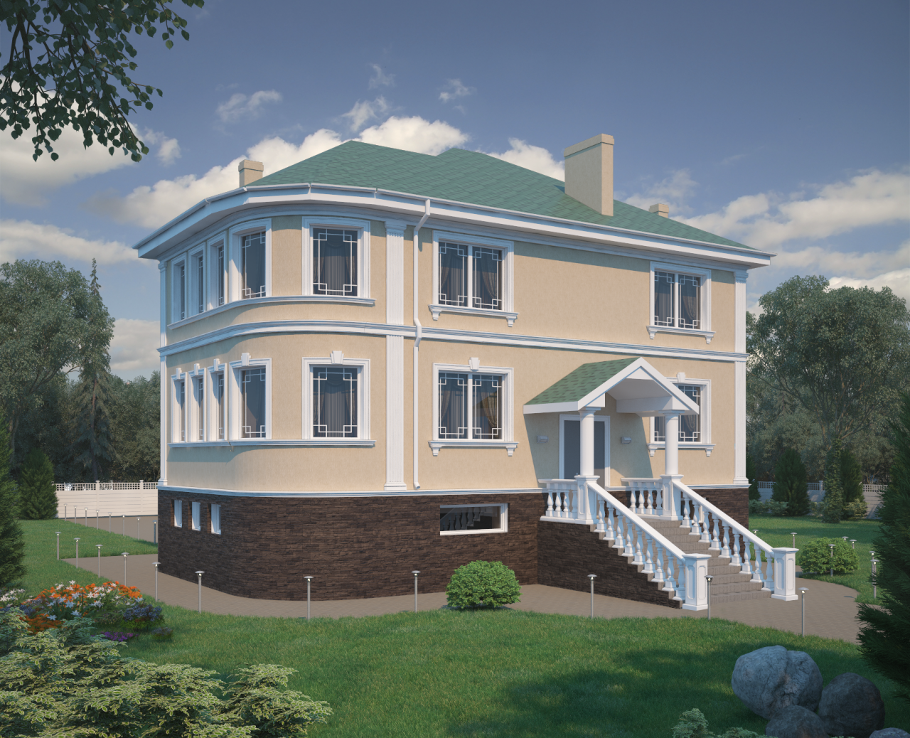 - К темно-зеленой крыше — фасад белого, желтого, бежевого и серого цветов.