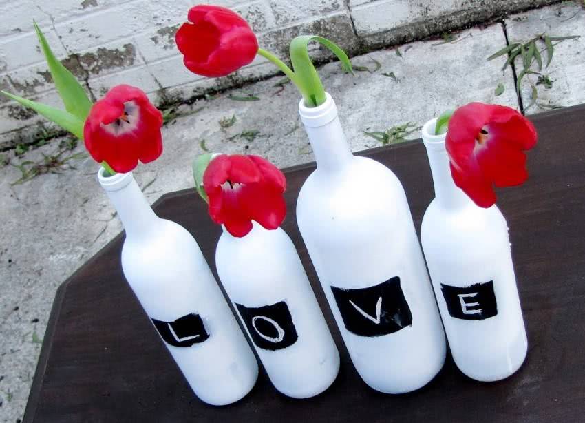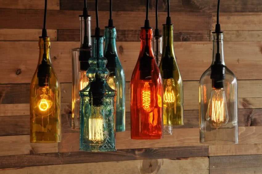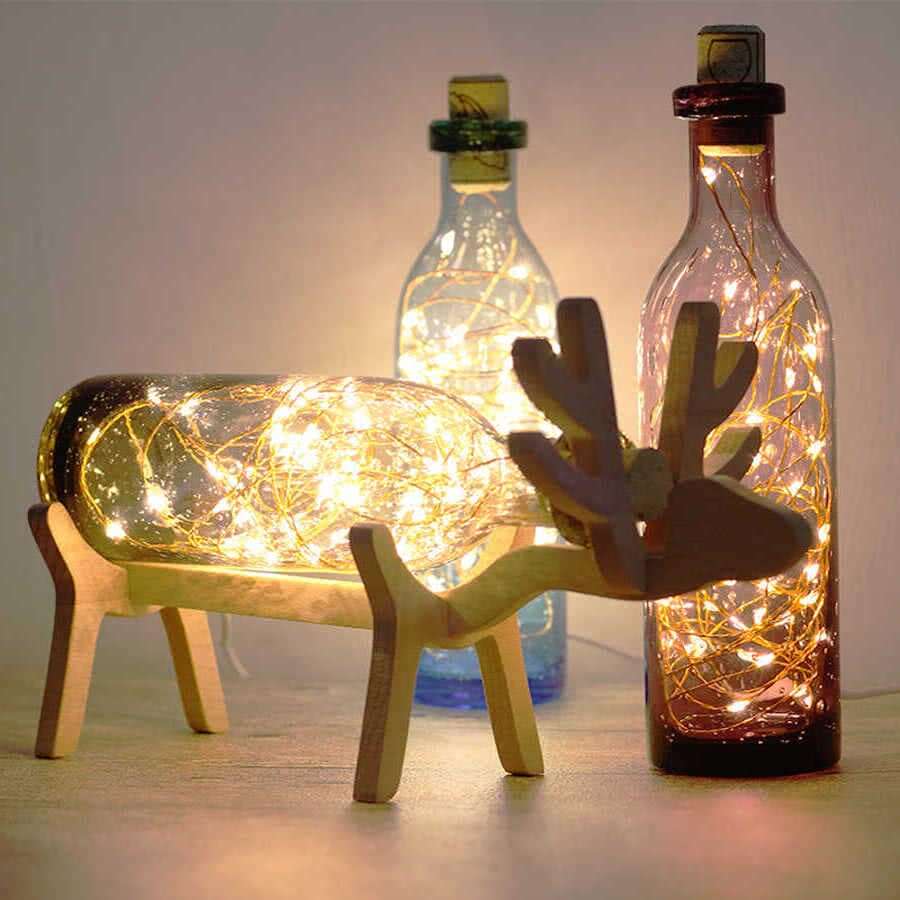 Обычные бутылки легко превращаются в стильный артобъект. Достаточно нанести на них при помощи трафарета и специальной краски интересный рисунок. После высыхания добавляют светодиодную ленту или гирлянду, и в помещении появляется элегантный ночник.