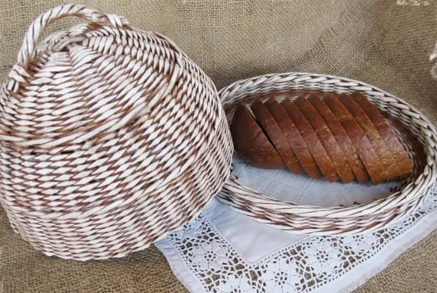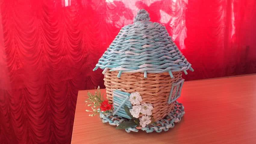 - Нарезаем бумажные полосы размером 7 на 45 сантиметров и делаем из них трубочки. Их нужно будет приклеить ко дну пластиковой емкости. Длинную трубочку приклеиваем к днищу и обматываем ее, оплетая другие трубки. Таким образом нужно обмотать всю емкость.