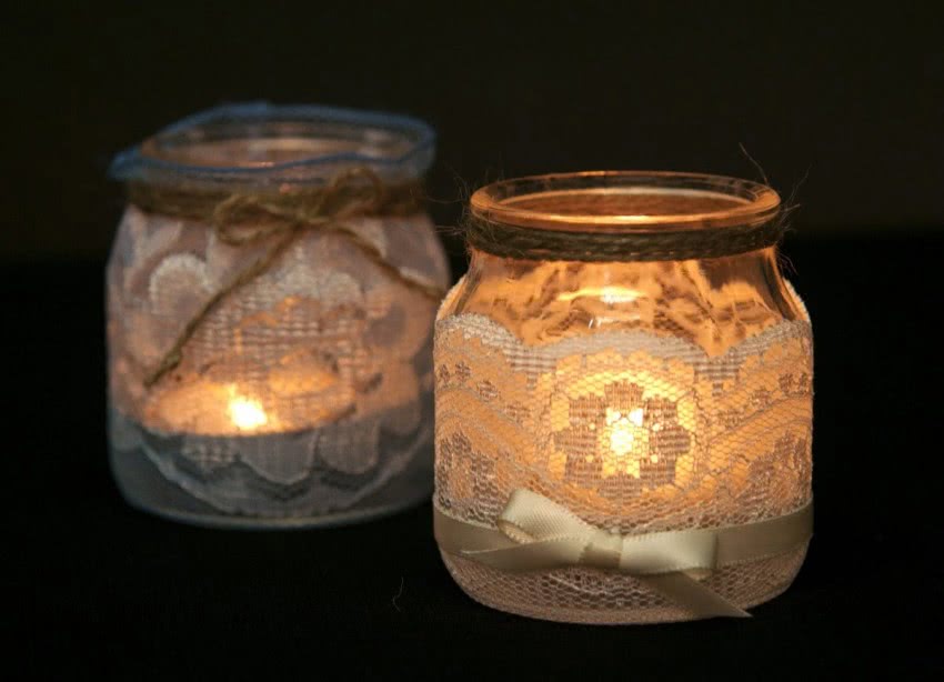 Так красиво использовать в саду свечи, но их постоянно задувает ветром. Чтобы такого не происходило, можно сделать подсвечники из пустых консервных банок или из обычных стеклянных. Можно все украсить камешками или лентами по желанию.