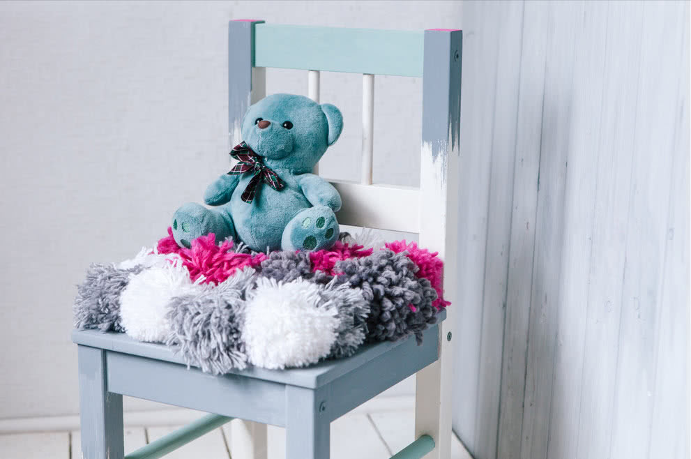 Из старого стульчика с потертостями и царапинами несложно сделать красивый и стильный предмет интерьера. Приготовьте краски, малярный скотч и цветные шерстяные нити, чтобы сшить для стульчика милую подушечку с помпонами.