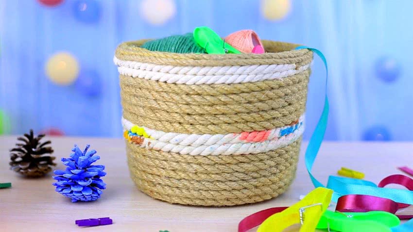 - Сквозь отверстия протягиваем веревку и фиксируем ее узлом с двух концов. Чтобы скрыть узелки, необходимо вплести еще одну трубочку в горшок.