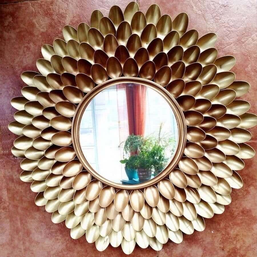 Все чаще в роли поделочного материала выступают пластиковые ложки. Подготовив около 250 этих изделий, а также клеевой термопистолет, плотный картон, ярко-малиновую краску для пластика в аэрозольном баллончике, круглое зеркало, можно приступать к работе.