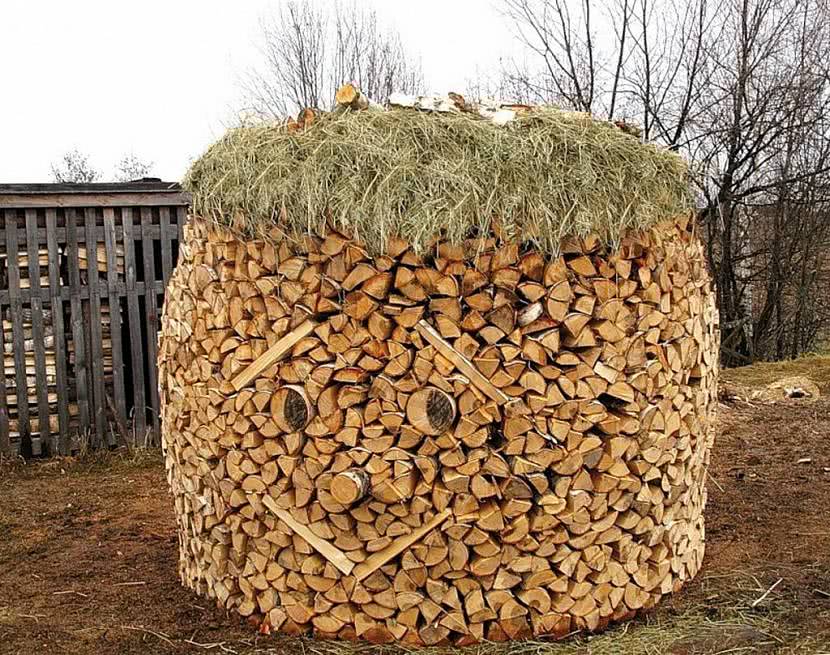 Стог. Способ очень схож с предыдущим, только занимает меньшую площадь. Таким образом можно хранить дрова на дачном участке.