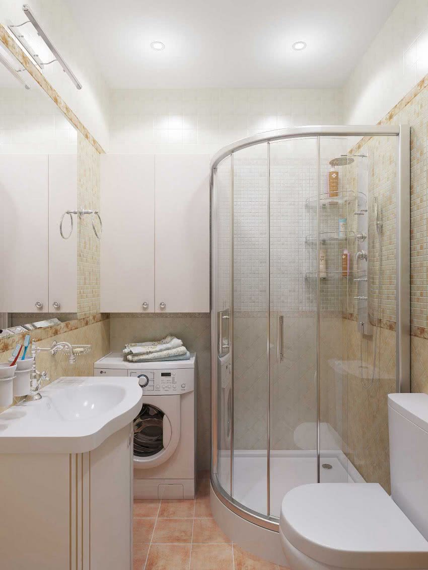 Оснащение санузла душевой кабиной вместо ванной, решит массу проблем. Благодаря компактности такой конструкции, между унитазом и душевой поместится еще раковина и стиральная машинка.