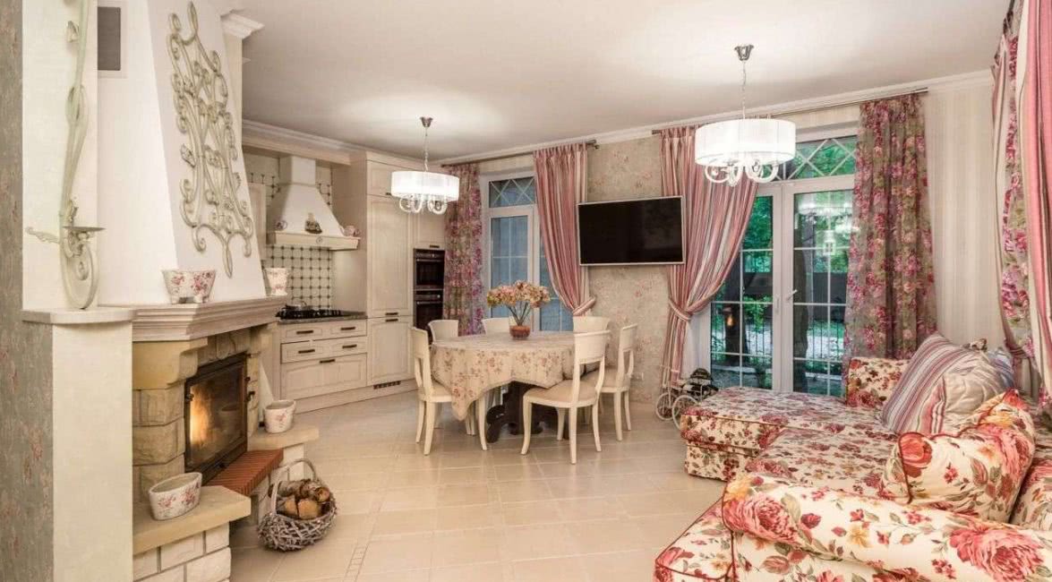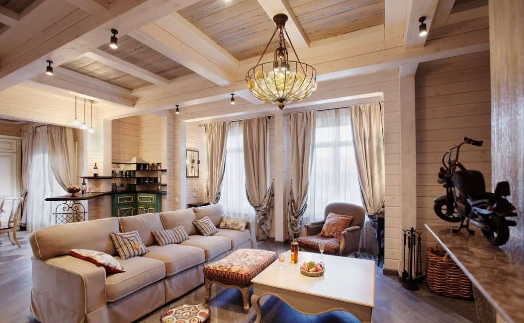Кантри. Гостиные в подобном оформлении встречаются чаще в загородных домах и дачах. Для них свойственно использование натуральных материалов, таких как ткани или дерево. Осветительные приборы в стиле кантри также имеют в конструкции экологически-чистые элементы. Размеры и цвета люстр зависят от конкретного интерьера.