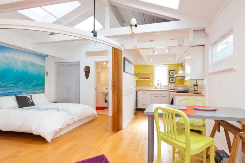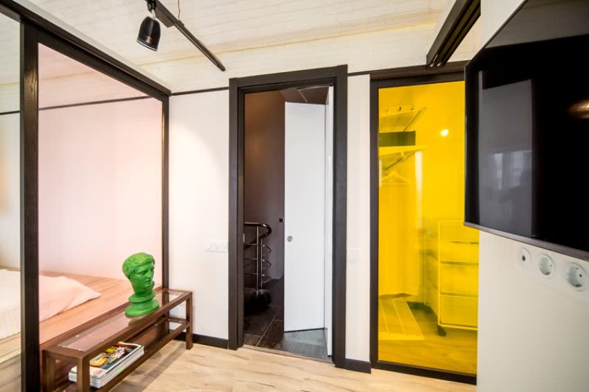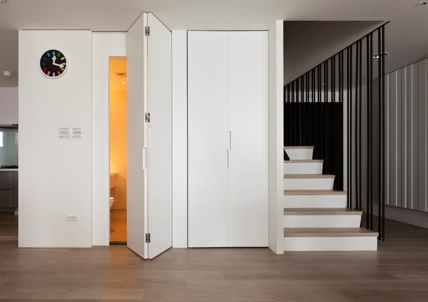 - Двери с подобным механизмом не стоит ставить в проемы с небольшой шириной. Это нелепо выглядит со стороны, к тому же, сам проем будет ещё меньше, что делает неудобным передвижение человека;