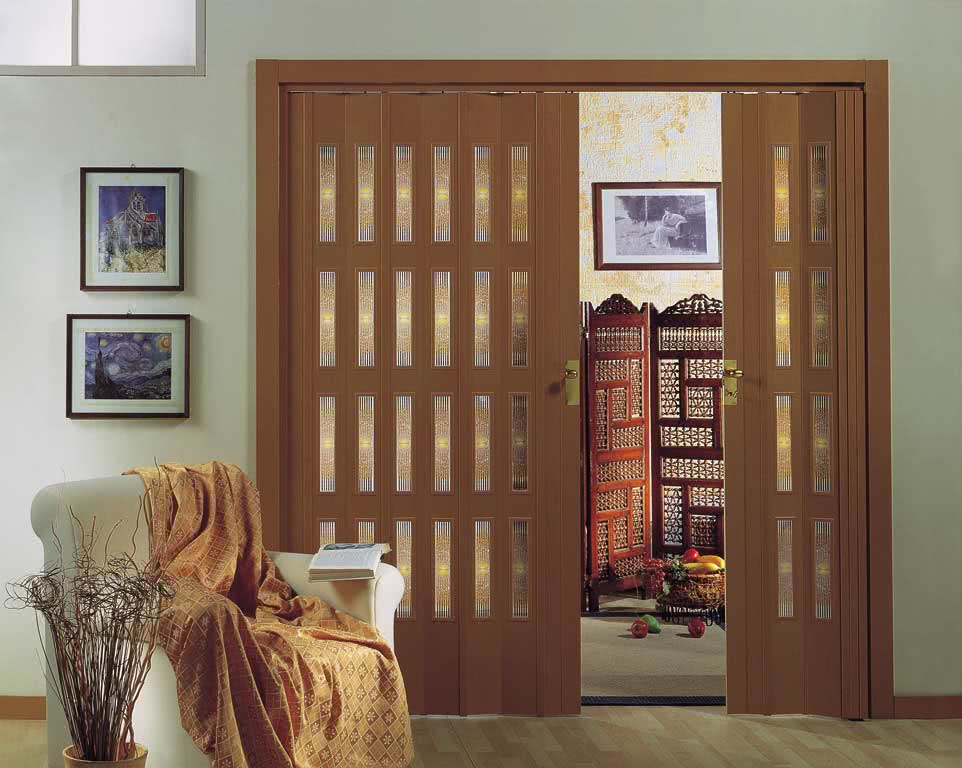 Что касается внешнего вида, то он зависит от того, из какого материала изготовлена та или иная модель. Например, деревянное полотно может быть задекорировано шпоном ценных пород дерева или заламинировано. Что касается пластиковой двери гармошки, то она имеет широкую цветовую гамму. Стекло обычно декорируется специальными пленками, либо рисунками по пескоструйной технологии.