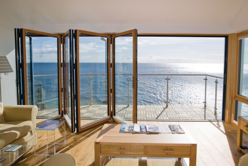 Стеклянная складная перегородка между гостиной и террасой