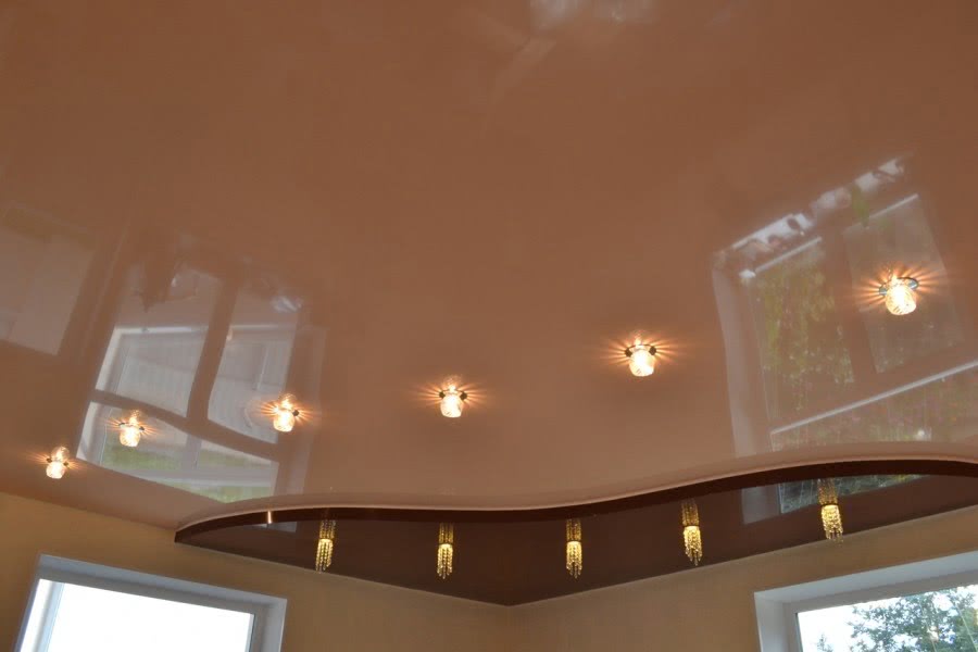 - глянцевые (только ПВХ). Имеют высокий коэффициент отражения вплоть до зеркальной фактуры. Их использование визуально увеличивает пространство и высоту помещения. Кроме того эти полотна имеют высокую отражающую способность, что обеспечивает более интенсивный свет от источников средней мощности. Стоимость не намного выше, чем у матовых материалов;