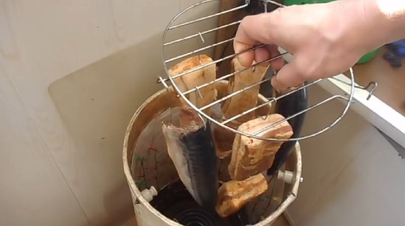 Уложите кусочки сала или дичи на сетку, затем закройте короб и закрепите над огнем. Первая порция будет готова через 20 мин.