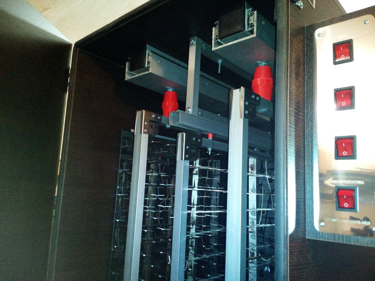 В верхней части коптильни на керамических изоляторах установлена решетка, на которую одевается подвеска с продуктами. К решетке подключается отрицательный электрод электростатического генератора. Вдоль стенок коптильни укладывается ватман с наклеенной проволокой, это положительный электрод. На проволоке припаяны заостренные отрезки из той же проволоки, они направляют поток заряженных молекул в сторону продуктов.