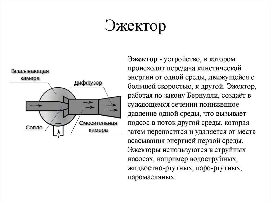 К эжекторному устройству подключаются две разные по диаметру трубы, за счет разницы давления в смежных трубах создается напор