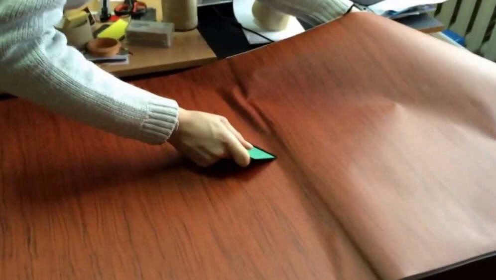 Разглаживать удобно резиновым шпателем или чистой тряпочкой, если будут появляется пузырьки воздуха, их протыкают или надрезают и сразу разглаживают.