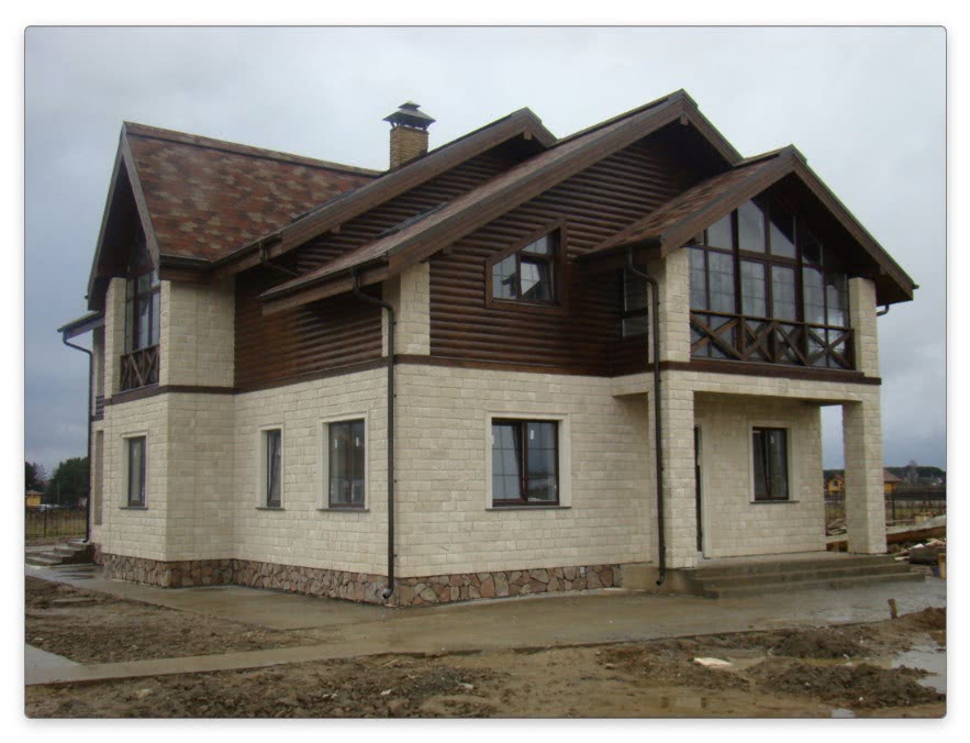 Не меньшей популярностью для внешней отделки брусового дома пользуются искусственные материалы. Они отличаются легкостью выполнения монтажных работ и последующего ухода, прочностью поверхности и длительным периодом эксплуатации.