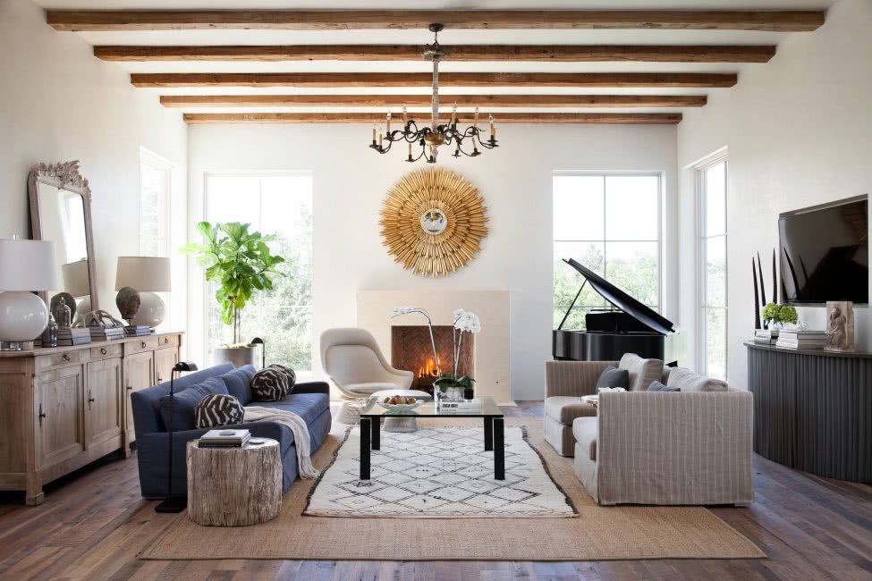 Красивейший пример оформления гостиной загородного дома, имеющей широкие окна и двери на смежных стенах. В оформлении высокого потолка-крыши ключевыми элементами являются окна, балки и стильные люстры на подвесах. Мягкая мебель возле камина и ковровое покрытие создают атмосферу домашнего очага.