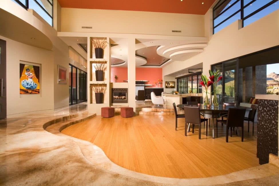 Волнообразные и криволинейные фигурные потолки – существуют во множестве видов. Волны могут быть как «каемкой» по периметру помещения, так и разделителем комнаты на две или более зон, каждая из которых обладает своей функцией. Пример – в изображении ниже, где с помощью подобного потолка выделено место для обеда и ужина.