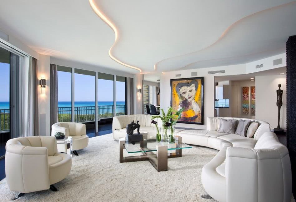 - Оформление необычных потолков должно гармонировать с общим дизайном помещения. Выдержанная в строгой геометрии мебель и аналогичное оформление стен будет диссонировать с многочисленными плавными завитками. И напротив, мягкие очертания убранства (круглые столики, изогнутые абрисы полок и т.п.) плохо сочетаются с угловатыми ярусами. Всегда уместно радиусное оформление – круги и полукружья.
