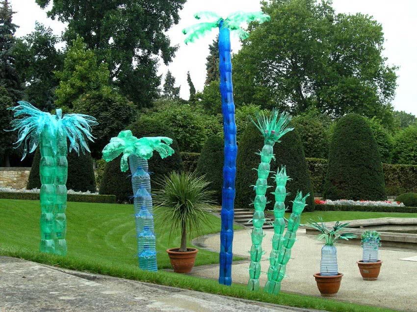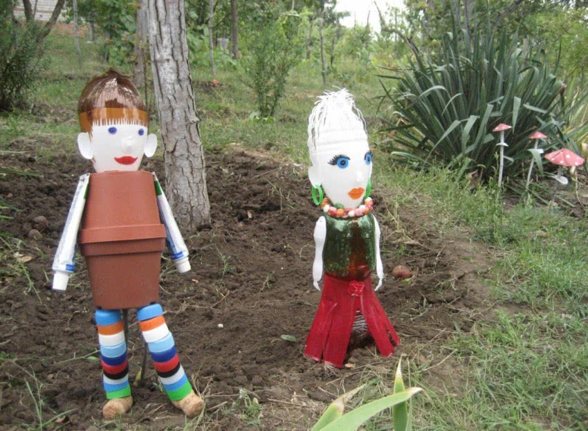 Возможно использование и подручных материалов – например, старых колготок. Конечно, такие изделия смотрятся просто. Они уж точно не подойдут для дворцового стиля, но будут поднимать настроение и станут замечательной изюминкой вашего участка. Многие выбирают для создания садовых фигур обычные пластиковые бутылки. Изделия могут быть любыми, главное – не ошибиться с выбором лакокрасочных материалов. Для таких поверхностей лучше выбирать масляные или акриловые краски.