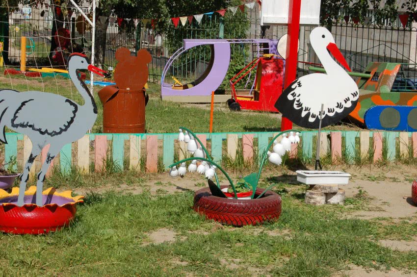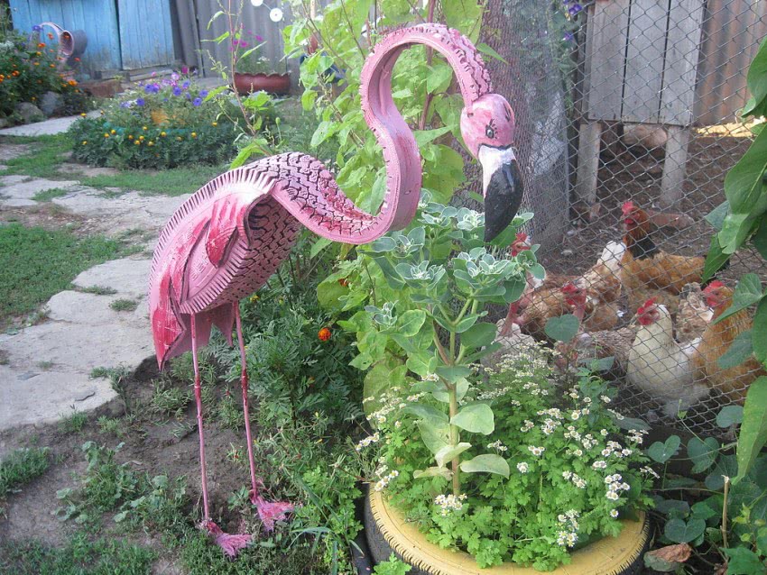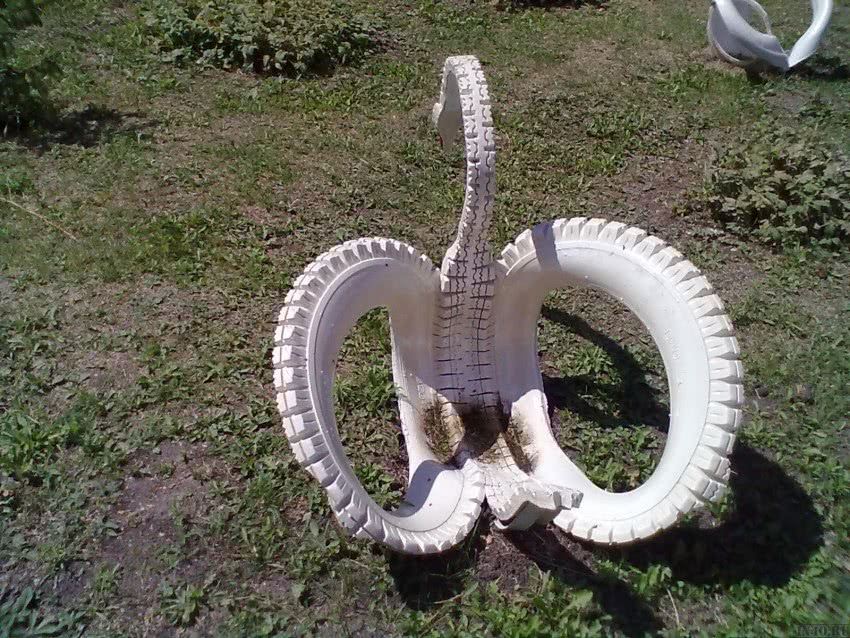 Автомобильные шины и покрышки – второй по частоте после пластмассовых бутылок материал для украшения сада или дачи. Из них делают птиц и животных. Оригинально смотрятся, например, лебеди из покрышек.
