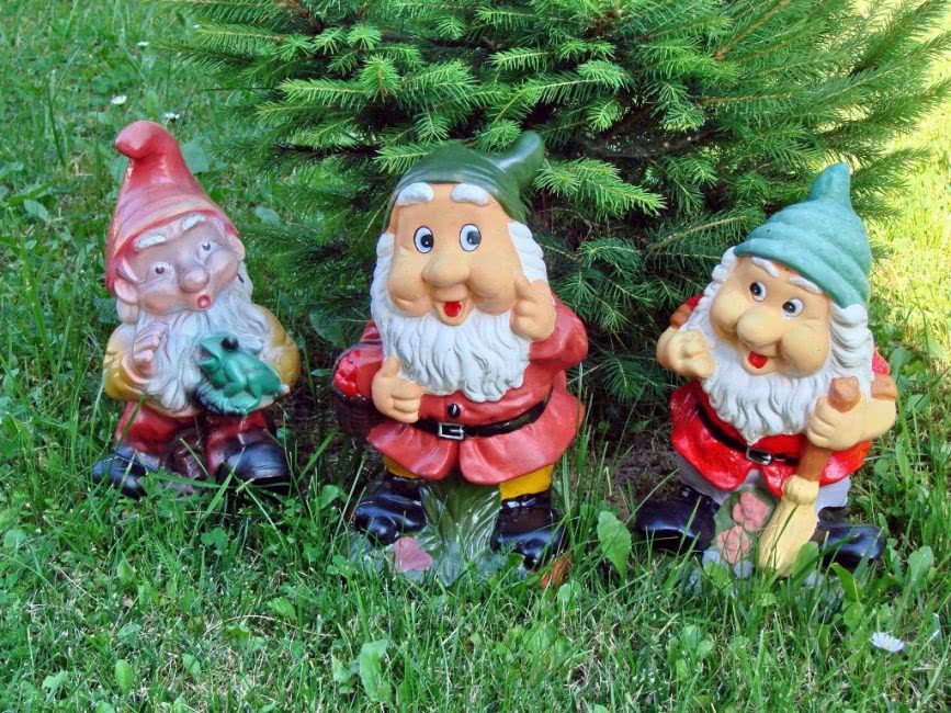 Во время долгого лета гипсовые фигурки нередко теряют форму, лакокрасочный слой выцветает, местами начинает трескаться и шелушиться. Проблемы начинаются из-за применения неподходящей или низкокачественной краски или неправильных условий эксплуатации (если гномы весь сезон провели в слишком влажном месте). Вы можете воспользоваться зимней передышкой и отреставрировать забавных жителей сада. Для этого поврежденные участки краски зачищаются металлической щеткой, возможные трещины замазываются гипсовым раствором или штукатурной смесью. Обработанные места грунтуются и подкрашиваются (если под рукой нет акриловых красок, подойдет и гуашь). Высохшая фигурка целиком покрывается лаком для наружных работ; после реставрации она снова готова занять свое место под солнцем.