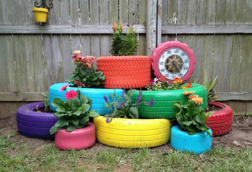 Интересный вариант – использование автомобильных шин. Поскольку такой материал отличается доступностью, его можно встретить на многих участках. Резина устойчива к температурным перепадам, поэтому изделия из покрышек служат достаточно долго. Единственный минус – на них нужно регулярно наносить краску.